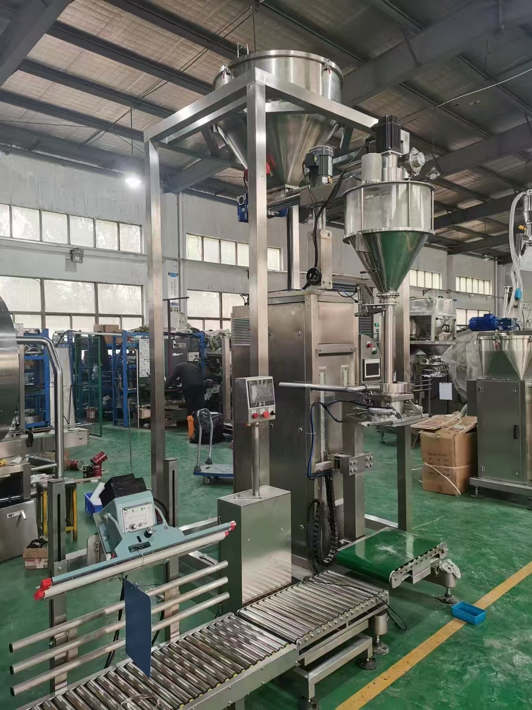 9、包裝秤使用過(guò)程:人工協(xié)助上袋,自動(dòng)稱重、夾袋、充填,經(jīng)輸送帶傳遞進(jìn)行自動(dòng)封口或縫包