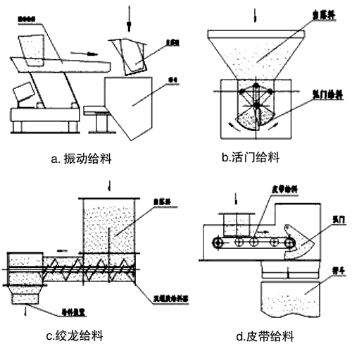 圖1中一部分也可以根據(jù)物料特性相互結(jié)合起來使用,通過在各種給料結(jié)構(gòu)上采取相應(yīng)措施產(chǎn)生符合要求的粗細給料組合,例如利用振動和活門給料結(jié)合,利用給料槽的不同尺寸,利用絞龍或皮帶電機的不同速度等!∑渲薪o料裝置結(jié)構(gòu)形式較多,主要有:電磁(電機)振動式、重力(活門或插板)式、螺旋(絞龍)推進式、皮帶輸送式、強流給料等。