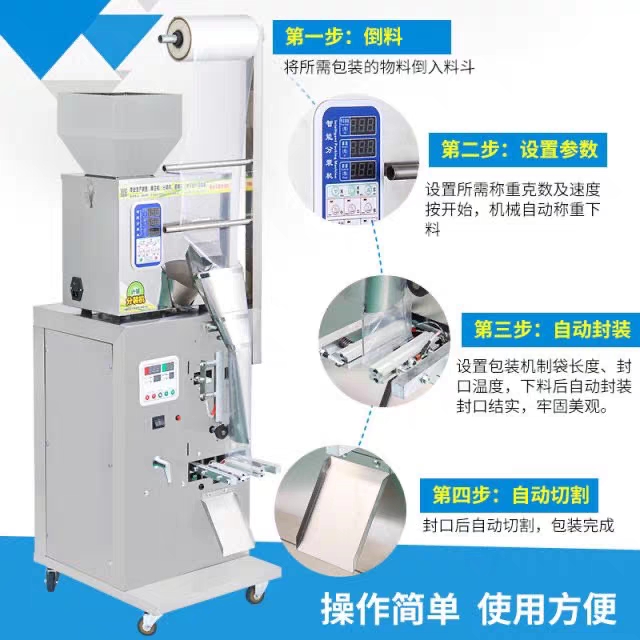 7.彩色觸摸屏和穩(wěn)定可靠的雙軸高精度輸出的PLC控制,制袋、計(jì)量、充填、封合、打碼、切袋一次完成.